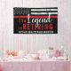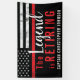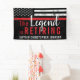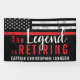 Ce design présente un drapeau de pompiers avec des bandes noires et blanches, ainsi qu'une fine bande rouge. Le texte "La légende prend sa retraite" est placé au-dessus du nom du pompier, lieutenant ou chef qui part à la retraite. Célébrez avec style !