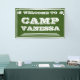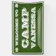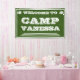 Bienvenue à Camp Bride. Une bannière personnalisée de style vintage pour accueillir toutes les besties à votre Camp Bachelorette. Des pots de lettrage blanc contre l'arrière - plan vert de la forêt - un camionnage classique. Les accents de pin complètent le style rustique rétro. Ajoutez votre nom de camp personnalisé. Ce texte et tout le texte peuvent être personnalisés. Vibes de camp les années 70 authentiques pour votre Camp Bach ! Vert forêt avec texte blanc et accents. Les couleurs peuvent être customisées dans l'outil de conception.