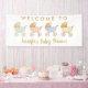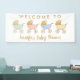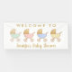 Bienvenue dans votre baby shower avec cette mignonne bannière d'accueil minimaliste et neutre en baby shower, qui présente une parade de chariots rétro rétro vert menthe pastel, rose, bleu et jaune et le nom de la future mère dans un script élégant. Amusant pour la conduite par des parades de baby showers.