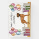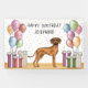 L'illustration originale de Destei d'un mignon chien de race Rhodesian Ridgeback. Le chien est placé dans un cadre d'anniversaire coloré avec des ballons d'anniversaire et des cadeaux de couleur pastel. Les couleurs pastel sont le rose, le vert, le bleu, le rouge, l'orange et le violet. Le chien est debout sur une texture de plancher de bois jaune et l'arrière - plan a un motif de pois de couleur pastel ludique. Vous trouverez également une zone de texte personnalisable.