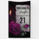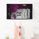 Une bannière d'anniversaire avec un look gothique. Un vieux papier parchemin gris avec des touches de rouge violet autour des bords. Un rose magenta en pleine floraison, un rosebud, une bougie et un casier argenté sur un arrière - plan bordeaux foncé crée un design gothique magnifique, sombre et mystérieux.