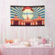 Cirque cool Design à thème 3 rouge et blanc rayé Big Top avec bleu et blanc rétro burst arrière - plan.Bordure étoile rouge. Idéal pour l'anniversaire ou tout autre événement thématique de cirque ou de carnaval. Customisez avec votre propre nom/texte et âge. Miss Sassy Party Designs 2022