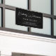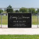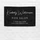 Panneau publicitaire noir chic pour votre entreprise avec une ambiance minimaliste avec votre nom d'entreprise ou marque dans un script de signature blanc élégant et texte supplémentaire ci-dessous en lettres blanches simples et modernes.