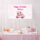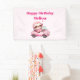 Bannière d'anniversaire avec une illustration fantaisiste. Un paresseux rose qui circule dans une décapotable rose. Adorable.