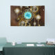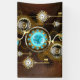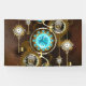 Turquoise lenses with antique watch with brass gears and golden keys on rusty, brown background. Steampunk style.