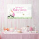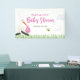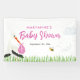 Banderole de fête personnalisable et charmante pour un baby shower de fille avec une cigogne mignonne avec abeilles et papillon sur une prairie. Un arrière - plan pastel doux, et en son centre une cigogne fantaisiste, illustrée avec grâce, porte un paquet sucré enveloppé dans un tissu doux. Autour de la cigogne, quelques abeilles ludiques avec des sourires amicaux et un papillon volent autour, ajoutant une touche vivante à la scène. Des nuages doux et moelleux ornent le ciel. Célébrez l'arrivée imminente du nouveau bébé avec ce baby shower à thème de cigogne mignon. Cette illustration exprime un sentiment de joie, de chaleur et d'anticipation festive du nouveau membre de la famille. Personnalisez l'élément avec vos informations.