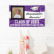 Raisin violet et blanc couleurs de l'école secondaire ou collégiale. Grand panneau géant ou bannière intérieure/extérieure, Félicitations au diplômé de la classe de (votre année). Customisez cette bannière personnalisée de jardin avec la photo, le nom, l'année et l'école de votre diplômé ou tout autre texte personnalisé. Bannière de la fête de remise de diplômes personnalisée en extérieur ou en intérieur avec l'année, le nom, le lycée de votre diplômé. Une façon spectaculaire de féliciter le diplômé et d'accueillir la famille et les invités à votre fête de remise de diplômes.
