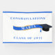 Bordure blanche et bleu royal, casquette de diplômé noire avec diplôme et gland bleu. Jolies fioritures dorées et bleues pour le nom de votre diplômé.