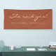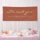 Bannière de douche nuptiale en terre cuite rustique avec texte dans une police de caractères moderne, "Elle a dit oui." Personnalisée avec le nom de la future mariée et sa date de douche.