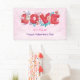 Une bannière de la Saint Valentin avec l'Amour écrite dans une police en caractères gras de bloc entourée de coeurs et de belles fleurs. Créé avec des aquarelles. Arrière - plan à motif rose clair.