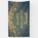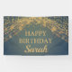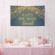 Turquoise élégant avec des lampes à cordes dorées scintillantes et bokeh pétillant "Joyeux anniversaire" bannière personnalisée avec le nom de l'invité d'honneur.