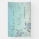 Bannière de réception mariage bienvenue avec deux élégantes tortues argentées et feuilles tropicaux sur un arrière - plan de style plage abstrait. Customisez-le avec votre nom de mariée et de mariée et votre date de mariage. Pour votre mariage hawaïen, mariage d'été, mariage de plage.