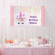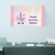 Une bannière d'anniversaire personnalisée conçue avec une licorne rose tendance. Orné d'une tête fleurie de fantaisie. Des papillons Whimsical volent autour de nous. De faux confettis en or parsemés le long du sommet. Un arrière - plan d'aquarelle jaune et violet pâle. Bordures roses sur les côtés.