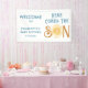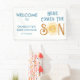 La bannière de baby shower de ce mignon garçon présente le texte "Here Comes The Son" dans une typographie bleue élégante avec un soleil d'aquarelle jaune souriant. Facile à personnaliser. Aquarelle originale © Michele Davies.