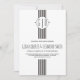 Bandes blanches noires et faire-part de mariage monogramme. Il affiche des bandes verticales au centre avec un cercle avec vos initiales et deux petits coeurs et votre texte. Le noir comprend une motif rayée noire et blanche.