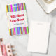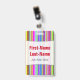 Ce modèle de badge présente un motif de bandes (ou de lignes) de différentes couleurs qui attire l'attention. Il comporte également un nom personnalisable en texte de couleur rouge dans une zone de couleur claire. Il y a également un message personnalisable sous le nom qui pourrait afficher des informations telles qu'un titre de poste, une profession ou un nom d'entreprise. [~Z0000176]