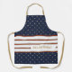 Un motif simple rayé aux accents de pois. Ce tablier tout-en-un-imprimé comporte une ligne rouge gras avec une ligne verte plus fine, de part et d'autre. Cette combinaison alterne avec une règle noire de cheveux et une bande blanche épaisse. En haut et en bas de ce design il y a un bloc de marine, avec des points dorés. Il y a une zone sur l'aire de trafic pour ajouter du texte personnalisé.