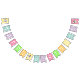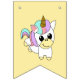 Bannière de couleur pastel pour votre fête d'anniversaire. sur trois des drapeaux est une adorable licorne blanche et jaune avec de grands yeux brillants une corne dorée et une crinière pastel rayée et la queue. Les mots "Joyeux anniversaire" sont épelés sur le reste des drapeaux.