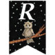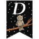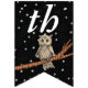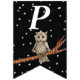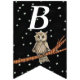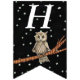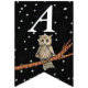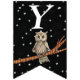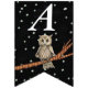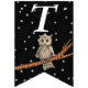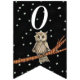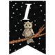 Cette bannière en forme de drapeau Happy Birthday est noire avec des étoiles blanches et une jolie chouette brune assise sur une branche d'arbre portant un collier bleu. Customisez l'année d'anniversaire avec les modèles.