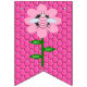 Ce magnifique bunting présente une image graphique d'un mignon bourdon rose avec des rayures rose vif, des yeux noirs, des antennes roses et des pattes noires. Il possède de jolies ailes bleues et blanches. L'abeille est assise au milieu d'un joli tournesol rose. La fleur a une tige verte et trois feuilles. Le message "Bee Day Girl" apparaît sur les trois feuilles. L'arrière - plan est composé d'un motif peigne rose vif.