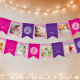 Bannière d'anniversaire joyeuse avec 8 de vos photos préférées, anniversaire heureux personnalisé à vous chanter et drapeaux customisés avec votre âge. Le design a une palette de couleurs audacieuses, violet et rose.