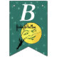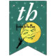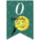 Cette bannière en forme de drapeau Happy Birthday est vert émeraude avec scintillement comme des étoiles blanches et un homme en costume escalade une échelle à une pleine lune jaune avec un visage souriant et le texte Reaching for the Moon sur chaque drapeau. Customisez l'année d'anniversaire avec les modèles.