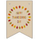 Ce magnifique bunting Thanksgiving présente une image art numérique d'une série de feuilles de chêne dans les tons rouge, orange, jaune et vert disposés en cercle autour d'un texte avec des lettres alternées de rouge, jaune, orange et vert qui dit Bon thanksgiving Day. Il y a du texte personnalisé sur les indicateurs alternatifs pour que vous puissiez inclure un message.