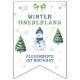 Anniversaire de enfant aquarelle. Aquarelle bonhomme de neige, flocons de neige, pins à feuillage persistant, arc vert.