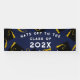 Banderole de félicitations pour la remise de diplômes créative avec casquettes de graduation en noir et or sur arrière - plan bleu marine. Modifier le texte pour modifier l'année de classe supérieure.