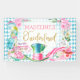 Sweet Alice au pays des merveilles bannière d'anniversaire thématique pour une première fête d'anniversaire. Ce design présente un grand casquette de chapeau fou et divers objets de l'histoire sur un arrière - plan de motif de diamant bleu. Le design comporte également une image texte amovible en faux or.