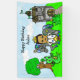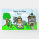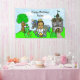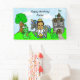 Petit Prince avec couronne et épée, et son cheval de compagnie, dragon et grenouille avec un château et arbre avec une chouette dans l'arrière - plan, bannière d'anniversaire personnalisée. Prince ethnique afro-américain, hispanique ou indien.