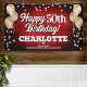 Banderole amusante pour l'intérieur ou l'extérieur, avec des ballons métalliques d'argent festif des deux côtés du design avec des confettis métalliques brillants et dorés sur un riche arrière - plan rouge texturé riche pour votre bannière d'anniversaire personnalisée. Ce produit sert aussi de merveilleux gardiens d'anniversaire.