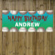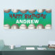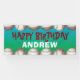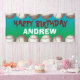 Bannière fête d'anniversaire avec bordure de baseballs en haut et en bas, arrière - plan de mélange bleu-vert, et votre texte et nom personnalisés. Pour le baseball ou le softball thème fête d'anniversaire (ou toute sorte de fête) ou accrochez-le au jeu pour une reconnaissance d'anniversaire spéciale.