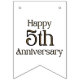 Cette bannière de fanion comporte les mots "5e anniversaire joyeux" dans une police d'impression unique avec des lettres dorées et un contour noir. Toutes les bannières ont une impression unilatérale sûre pour l'extérieur, fabriquées avec du polystyrène en plastique robuste et une corde en plastique épais, comportant (16) fanions à queue d'hirondelle de 5,5" x 8" sur une corde de 6' de long.