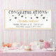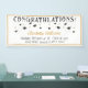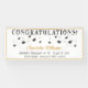 Une bannière de félicitations pour diplômé avec le nom du diplômé. Cette bannière est conçue avec une garniture de couleur or, avec des toques de diplômé sur fond blanc. Le texte comprend : Félicitations !, Le nom et le diplôme du diplômé. Pour personnaliser, insérez simplement vos informations dans notre modèle, en remplaçant le texte d'exemple.