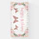Bannière de fête d'anniversaire sur le thème des papillons doux comprenant deux adorables arrangements floraux roses à l'aquarelle, un papillon à paillettes roses et quelques textes calligraphiés. Ce fond de joyanniversaire aux papillons est un ajout charmant à la fête du premier anniversaire de votre petite fille sur le thème des papillons.