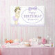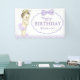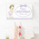 Banderole d'anniversaire de princesse violet avec adorable princesse petite fille portant des pantalons lavande violet rousse, couronne et arc sur une jolie dentelle violette et arrière - plan arc lavande. Vous pouvez ajouter le texte de votre choix pour personnaliser cette adorable bannière de fête de princesse pour votre occasion.