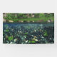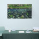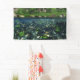 Une scène sous-marine scindée avec une vallée verte au-dessus et les profondeurs froides d'une rivière rocheuse en dessous. Les rayons du soleil dansent à travers l'eau et des bancs de poissons argentés nagent parmi les pierres et les mauvaises herbes du lit de la rivière.