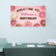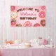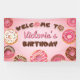 Tons super sucrés de rose, chocolat et crème Donuts sur un joli arrière - plan rose. Banderole de bienvenue pour une fête d'anniversaire de filles.