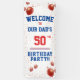 Une bannière de 50th Birthday Party Hanging Banner créée pour une célébration spéciale d'anniversaire du Père! Conçu en bleu et rouge gras avec ballons, confettis et texte : Bienvenue à, NOTRE DAD's, et fête du 50e anniversaire. Pour personnaliser, remplacez simplement l'exemple de texte en utilisant notre modèle pas à pas facile. Remarque - Le numéro d'âge peut être modifié comme vous le souhaitez !