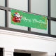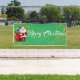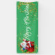 Cette bannière de Noël est présentée dans le style extérieur. Choisissez à l'intérieur ou à l'extérieur, avec ou sans grommets. Montré en vert avec le texte "Joyeux Noël" avec Père Noël et le script fantaisie avec deux tourbillons d'étoiles à l'aspect or à chaque extrémité. Customisez ou achetez comme prévu.