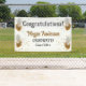 Bannière de félicitations pour Hanging Graduation conçue avec du texte de couleur or sur un arrière - plan blanc avec des ballons d'or et blanc et des étincelles. Pour personnaliser, il vous suffit de remplacer le nom de l'exemple par vos détails.