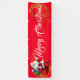 Cette bannière de Noël est présentée dans le style extérieur avec des grommets. Choisissez à l'intérieur ou à l'extérieur, avec ou sans grommets. Montré en rouge avec blanc "Joyeux Noël" avec Père Noël et script fantaisie avec deux tourbillons d'étoiles d'or à chaque extrémité.
