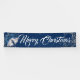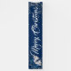 Cette bannière de Noël est présentée dans le style extérieur avec des grommets. Choisissez à l'intérieur ou à l'extérieur, avec ou sans grommets. Montré en bleu marine avec blanc "Joyeux Noël" avec cloches en argent et script fantaisie avec deux tourbillons d'étoiles en argent à chaque extrémité. Customisez ou achetez comme prévu.