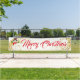 Cette bannière de Noël est présentée dans le style extérieur avec des grommets. Choisissez à l'intérieur ou à l'extérieur, avec ou sans grommets. Montré en blanc avec rouge "Joyeux Noël" avec Snowman et script fantaisie avec deux tourbillons d'étoiles à l'aspect or à chaque extrémité.