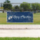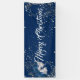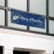 Cette bannière de Noël est présentée dans le style extérieur avec des grommets. Choisissez à l'intérieur ou à l'extérieur, avec ou sans grommets. Montré en bleu marine avec blanc "Joyeux Noël" avec cloches en argent et script fantaisie avec deux tourbillons d'étoiles en argent à chaque extrémité. Customisez ou achetez comme prévu.