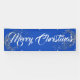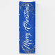 Cette bannière de vacances est présentée dans le style extérieur avec des grommets. Choisissez à l'intérieur ou à l'extérieur, avec ou sans grommets. Montré en Bleu avec un script blanc "Joyeux Noël" avec deux tourbillons d'étoiles gris argent à chaque extrémité. Customisez ou achetez comme prévu.