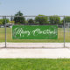 Cette bannière de vacances est présentée dans le style extérieur avec des grommets. Choisissez à l'intérieur ou à l'extérieur, avec ou sans grommets. Montré en vert avec blanc "Joyeux Noël" script fantaisie avec deux tourbillons d'étoiles gris argent à chaque extrémité. Customisez ou achetez comme prévu.