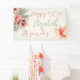 Bannière fête d'anniversaire avec fleurs et texte personnalisé. Des fleurs de Magnolia et des saules de chatte décorent le coin supérieur gauche. Une seule fleur de magnolia rose se trouve dans le coin inférieur droit. Le texte du script est rose rustique, avec son nom en vert sauge sur un arrière - plan écru. Cette conception est destinée à une célébration d'anniversaire d'une femme adulte. La grande bannière en tissu mesure 1,5 m sur 7 et est destinée à être accrochée au mur.