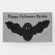 Cette étonnante bannière présente une chauve-souris vampire déplaisante aux yeux rouges maléfiques et aux crocs blancs tranchants. Ce design amusant est parfait pour Halloween et devrait amuser les enfants et les adultes. Il y a du texte personnalisable pour que vous puissiez personnaliser cette bannière.